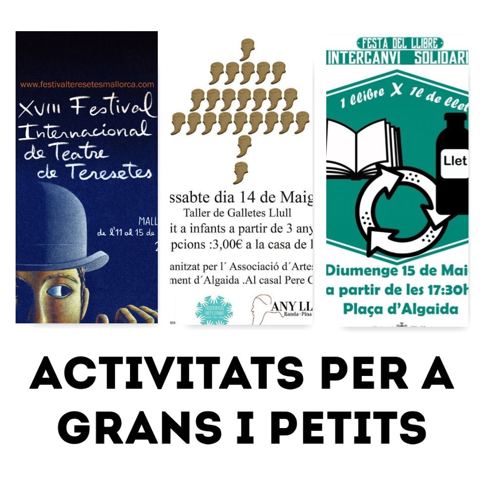 Aquest cap de setmana, Algaida celebra la festa del llibre. avui horabaixa hi ha el Contacontes Animalades. Narració de tres contes relacionats amb animals. Un d’ells ens serveix de fil conductor per explicar els altres dos. El conte conductor és Però, on és la biblioteca?, que és la història del caragol Valentí i la seva recerca de la biblioteca. Els altres dos són: Sopa de pedra i Sofia, la vaca que li agradava la música. A partir de les 17:30 a càrrec de Voramar teatre i l’aforament és limitat.