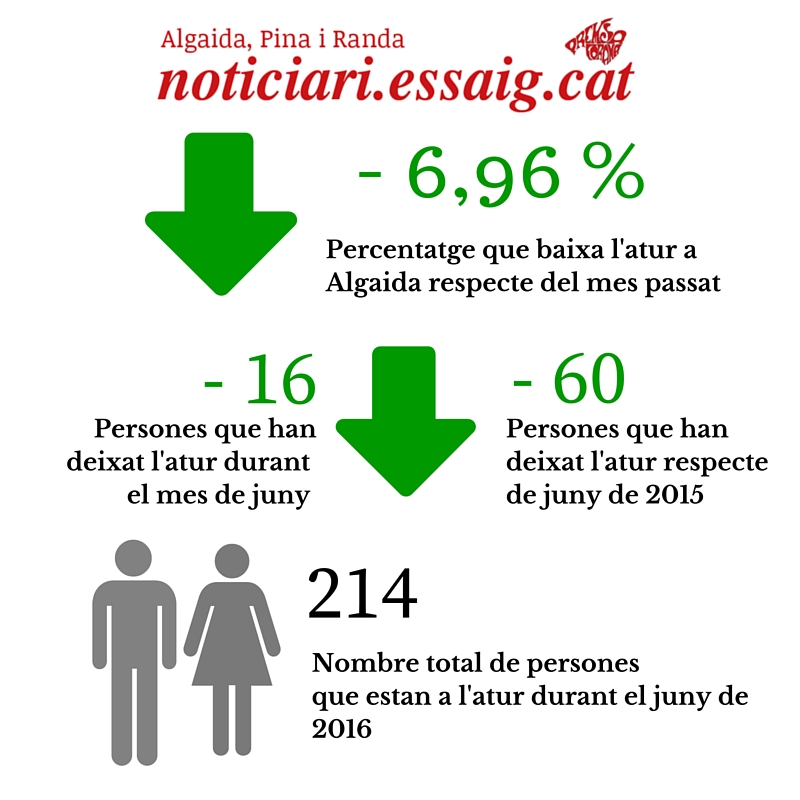 L’atur abaixa al mes de juny de 2016 a Algaida un 6,96 % respecte del mes de maig. La xifra d’aturats d’Algaida, Pina i Randa inscrits al SOIB apuja fins als 214, això vol dir que 16 persones han deixat de figura com a persones aturades durant aquest mes de març (7 homes i 9 dones). Això és perquè 18 persones han trobat feina però una l’ha perdut i l’altra s’ha apuntat al SOIB.