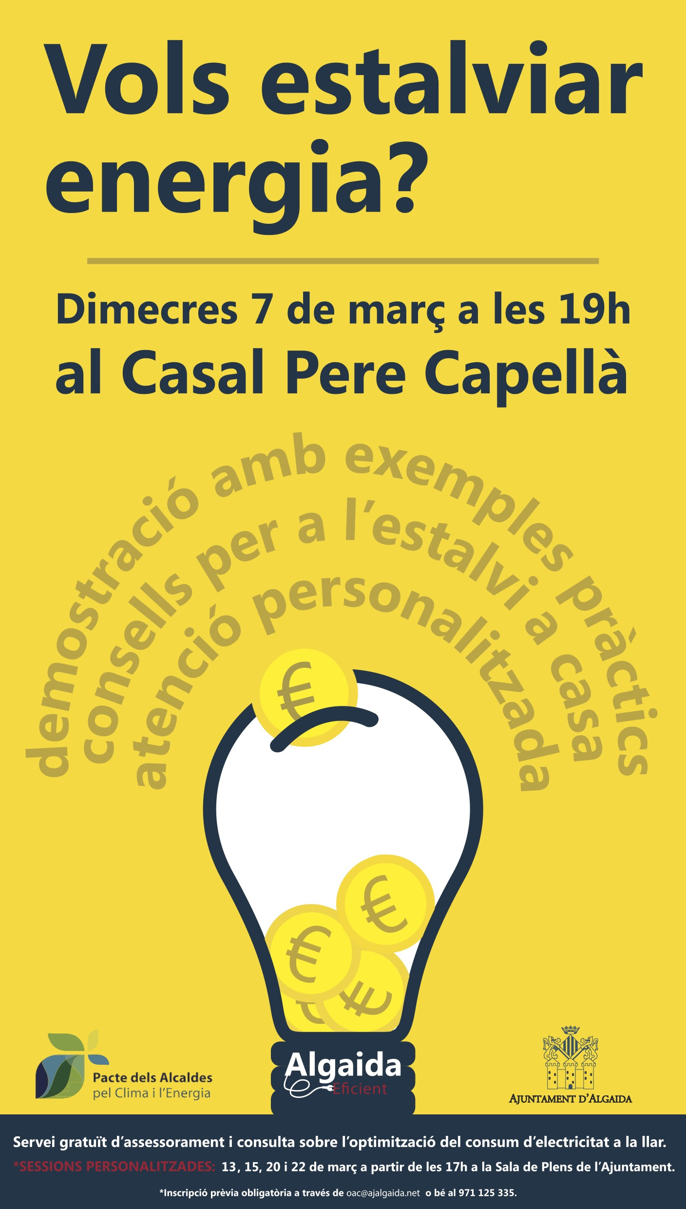 Posteriorment, els dies 13, 15, 20 i 22 de març a les 17 hores a la Sala de plens, l’Ajuntament d’Algaida, oferirà un servei gratuït d’assessorament i consulta sobre l’optimització del consum d’electricitat a la llar. Són sessions personalitzades amb inscripció prèvia obligatòria al correu electrònic oac@ajalgaida.net o al telèfon 971 125 335. Els interessats amb les sessions personalitzades han de dur les darreres 6 factures de consum energètic.